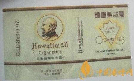 上世纪四十年代,由济南烟厂出品的“夏威夷”牌卷烟,为横标。正版一圆框内是一中年男子的侧面肖像。此人名叫陈芳,正是当时大清国驻夏威夷王国的第一任领事。夏威夷还不是美国领土时,陈芳已在当地从事商业贸易活动,并获得成功,成为华侨首富。他带动了夏威夷檀香木和制糖两大行业的发展。肖像的圆环外有金黄色光晕,衬托他的与众不同。副版上从右至左写有“夏威夷香烟”,其下画有一倒置的盾牌框,框内写有“Super Quality”,即高品质,外围亦有金黄色光晕,与正版的光晕呼应。烟标的底部还留有烟厂的详细地址。