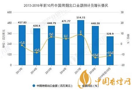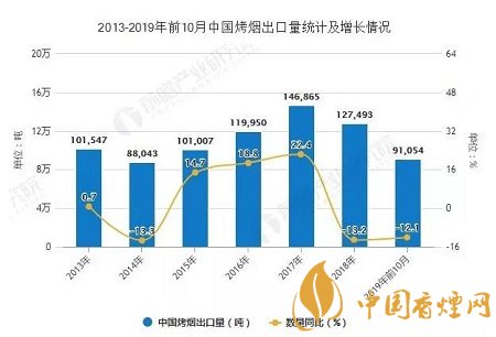 2019年前10月中国烤烟出口量突破9万吨。据中国海关总署数据显示,2019年10月中国烤烟出口量为6128吨。累计方面,2019年1-10月中国烤烟出口量达到91054吨,同比下降12.1%。
