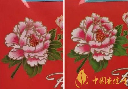 真品卷烟商标纸上的牡丹花瓣的粉红色采用渐变技术,颜色由深逐渐到浅,自然协调,立体感强;假烟采用普通仿制技术,粉红色部分集中于一角,颜色搭配较为死板,立体感差。