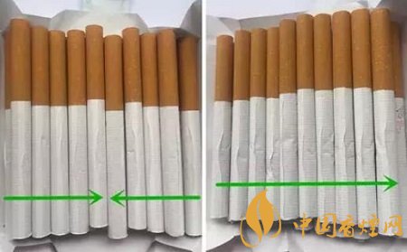 同一包卷烟内,真品卷烟烟支卷接纸有两个相反的搭口方向;而假烟的烟支卷接纸搭口方向均为同一个朝向。