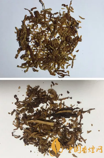 真品卷烟烟丝呈金黄色、丝条状,烟丝结构为纯叶丝,香气醇厚;假烟烟丝呈棕黑色,含末量大,烟梗较多,香精气味浓烈。