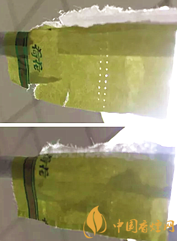 真品卷烟接装纸上有2排激光打孔,孔点均匀、排列整齐;假烟接装纸虽然也有2排打孔,但孔洞较小且未打透,孔点排列不规则。