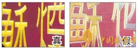 真烟:烫金字体线条清晰、不漏金,金色部分成色纯正。假烟:烫金字体线条不清晰,有漏金现象,金色部分成色暗淡。