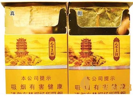 真烟内衬纸底部呈网格状,“黄鹤楼”字体及拼音较清晰;假烟内衬纸底部较平整,“黄鹤楼”字体及拼音模糊不清。