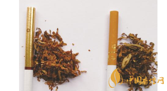 烟丝差异对比:真烟烟丝切丝宽度均匀,烟丝疏松、光泽油润性好,呈柠檬黄色,烟丝结构为纯叶丝;假烟烟丝切丝宽度不匀,光泽油润性较差,烟丝结构为叶丝和少量梗丝,与真品特征存在明显差异。