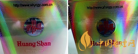 商标纸定位烫金工艺差异对比:真品小盒背面定位烫金,其成像效果字体及图案清晰完整,且边缘无明显脱漆掉色;假烟仿造技术粗糙,特别是烫金图案内的黄山及“Huangshan”拼音字体无法完整呈现出来,与真品烫金工艺存在明显差异。