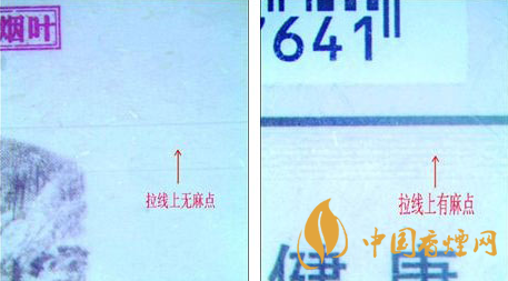2、真品卷烟拉线有麻点(点状胶痕),而假烟没有。
