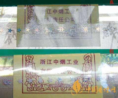看商标纸印刷方式:真烟的商标纸印刷方式为凹印与胶印相结合,黄色笔划边缘呈锯齿状、黑色笔划边缘光滑。假烟的商标纸印刷方式皆为胶印,字体笔划边缘都光滑。