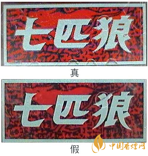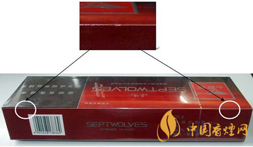由于印刷方式的不同,真品“七匹狼”(豪情)条、盒上的中英文字体边缘有锯齿状,假烟的字体边缘光滑。