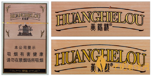 真品卷烟:商标纸采用凹印,黑色与黄色交界边缘有锯齿痕迹;“HUANGHELOU”拼音字母黄色为淡黄色。