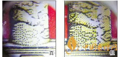1.小盒正面商标纸套色烫金工艺对比:真烟天安门左侧华表套色均匀,黄白色分布有明显分界点,边缘光滑、干净、清晰;假烟套色较差,黄白色不明显,黄色部分印刷较分散,字体边缘套印有毛渣点,呈现锯齿状。