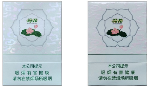假冒卷烟:该款假冒卷烟外侧花瓣无银色亮点;黑色边缘线颜色重,无凸起白色轮廓线;荷花字体烫金漏烫;荷花花瓣粉红色无过渡色,花芯图案糊在一起。左真右假