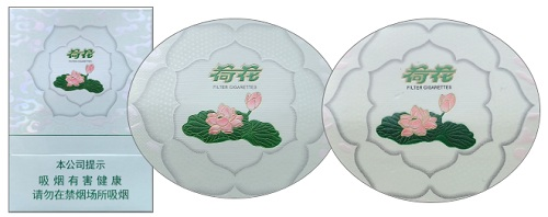 真品卷烟:侧光看,外侧花瓣图案会有均匀排列银色亮点;黑色边缘线颜色过度自然,黑色边缘会有凸起白色轮廓线;荷花字体立体感强,烫金完整;荷花花瓣粉红色有过渡色,花芯图案清晰可见。